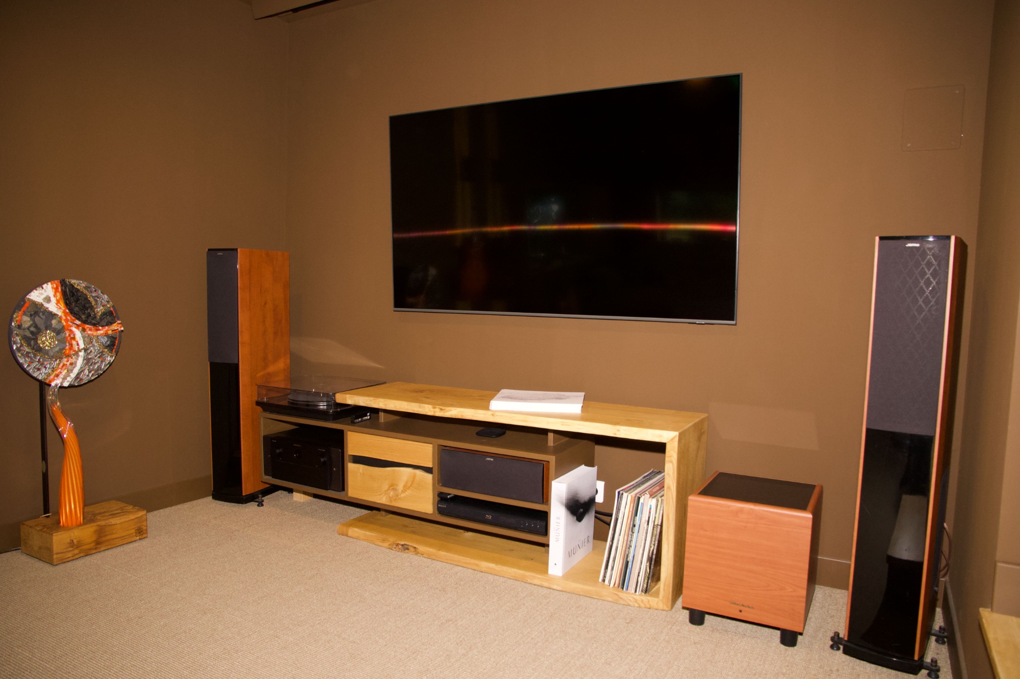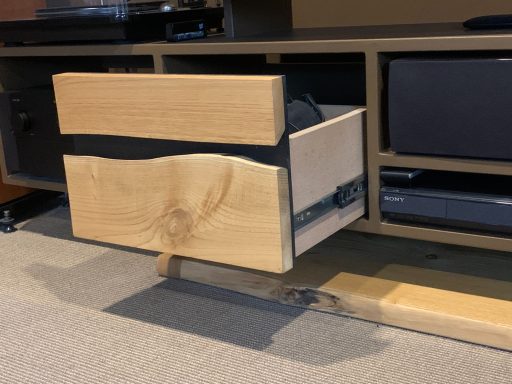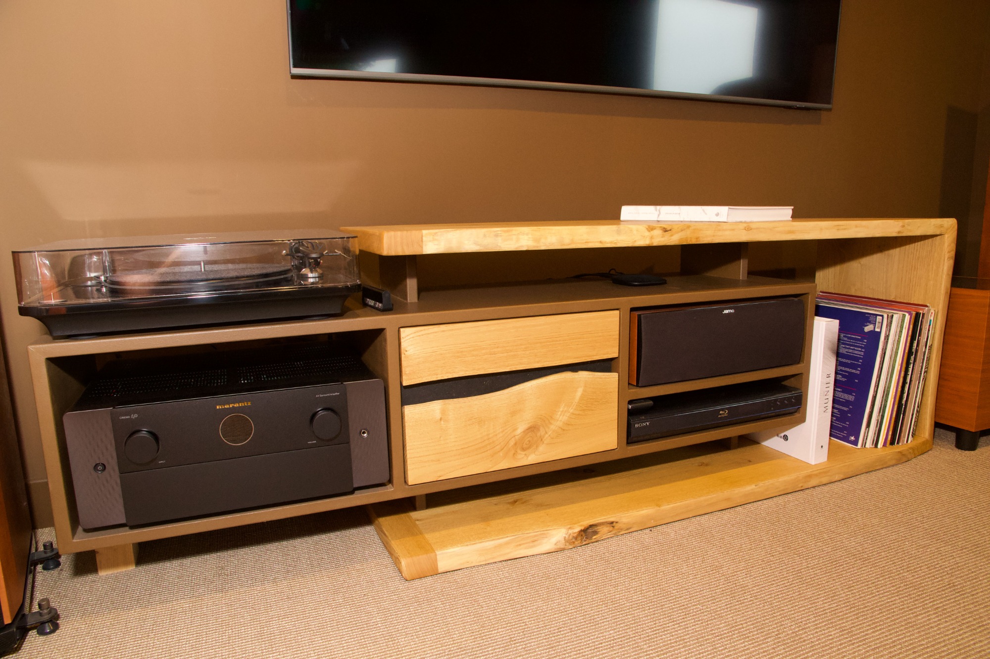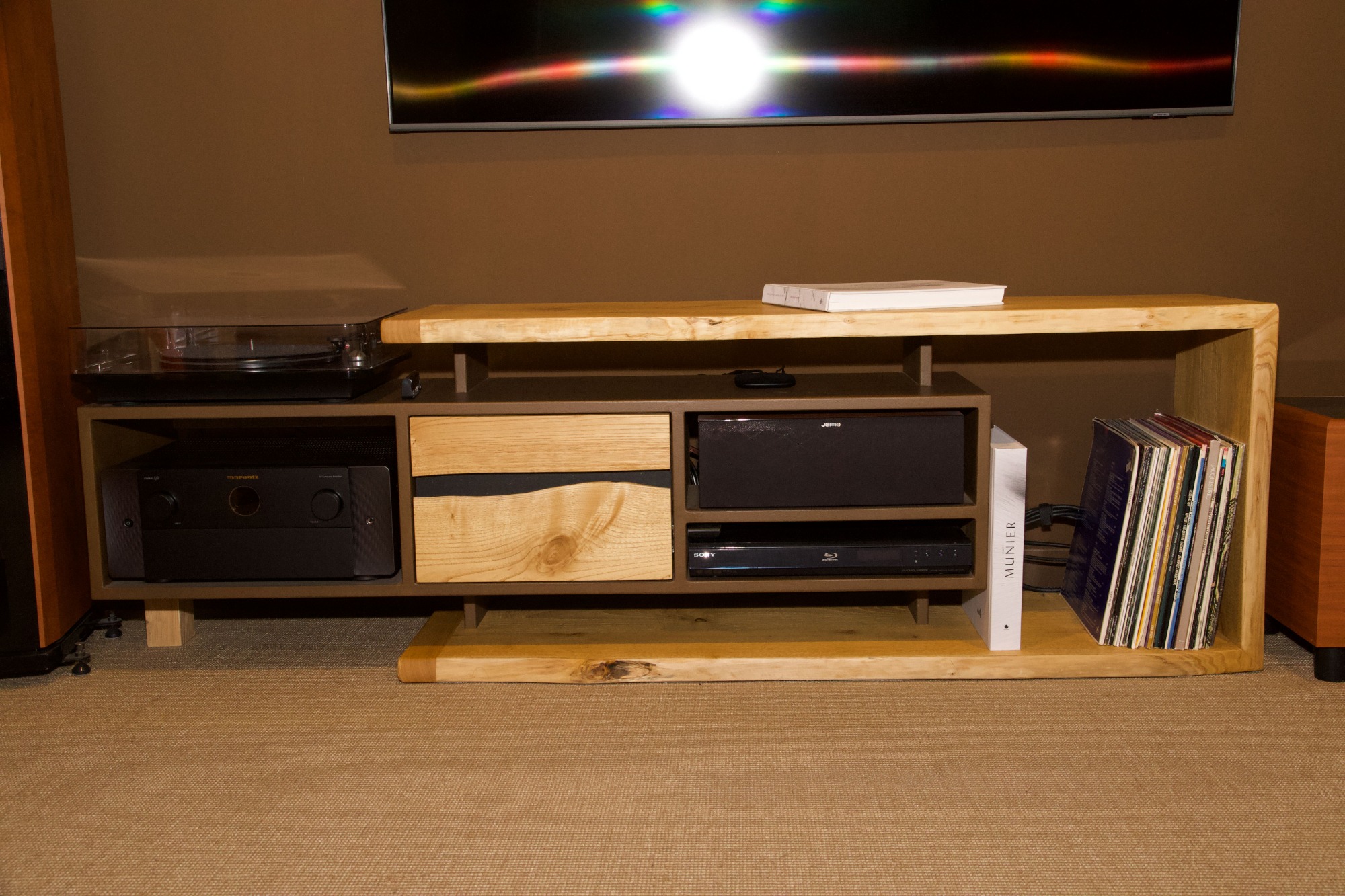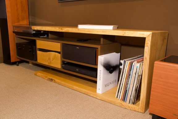 Ce meuble contient les éléments nécessaires à un home cinéma de qualité. À savoir un amplificateur, un lecteur et une enceinte centrale. Il intègre également un tiroir pouvant accueillir, casque, lunettes 3D et autres télécommandes. Une platine vinyle a également trouvé sa place.
