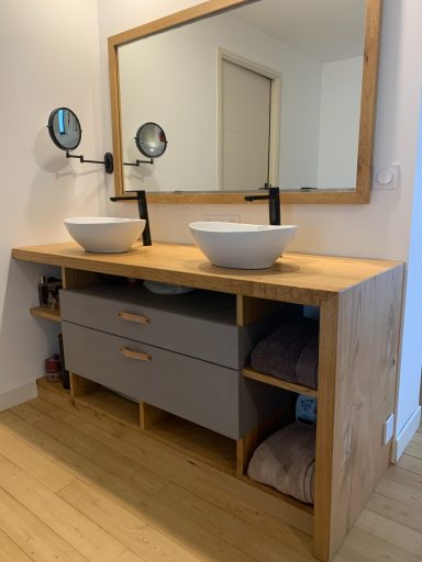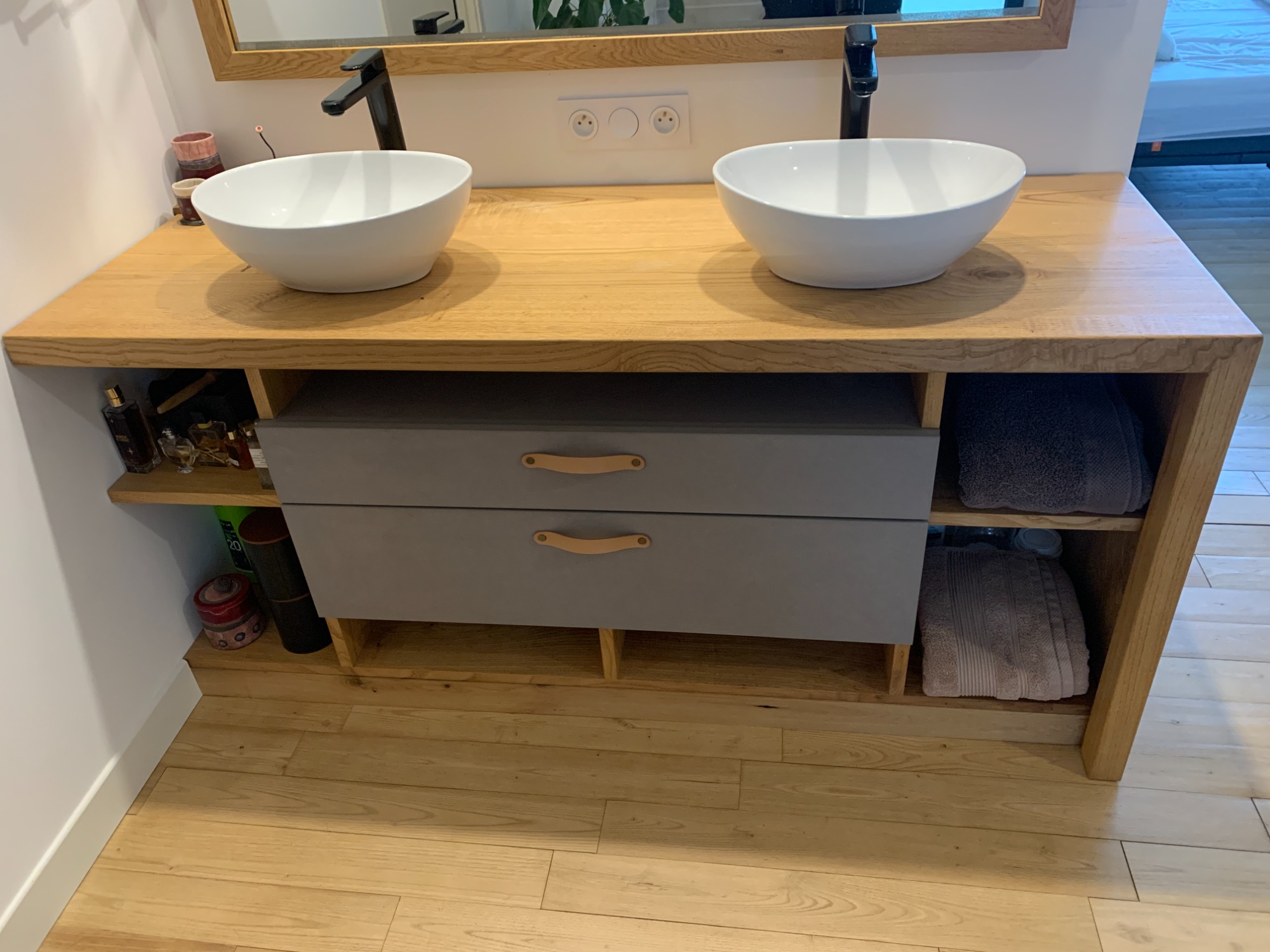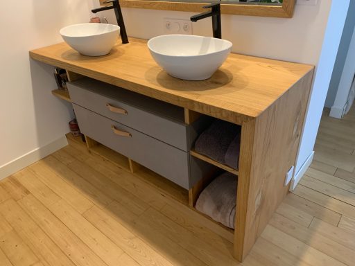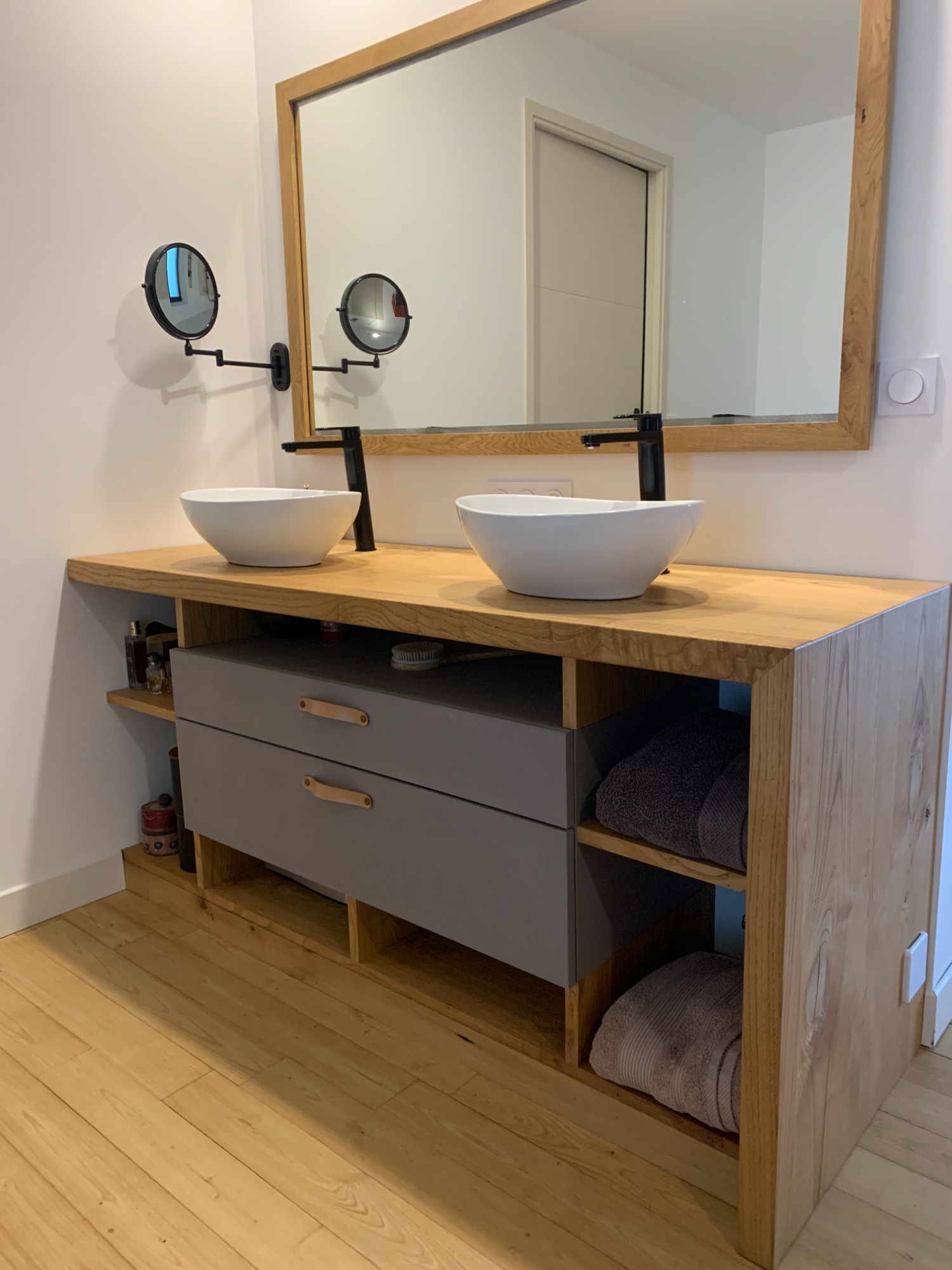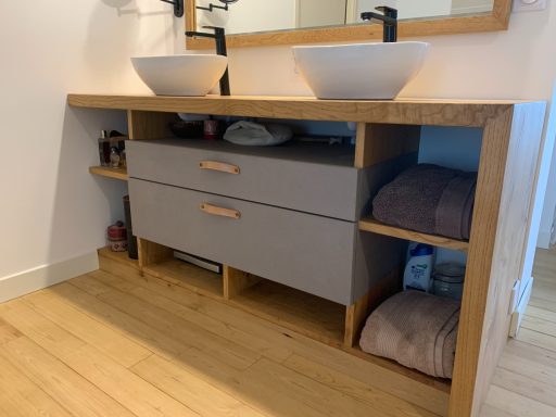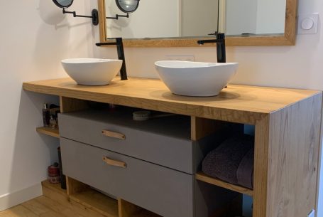 Ce meuble de salle de bain réalisé sur mesure allie le châtaignier et le Valchromat gris. Il comporte dans sa partie "suspendue" 2 grands tiroirs. Il est traité avec une huile spécifique qui permet à la fois de lui conférer une résistance à l'eau tout en conservant le toucher naturel du bois.